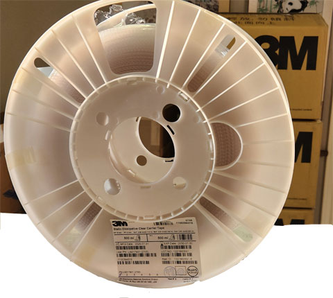 Transparent Carrier Tape for 1210-080 package, very popular 1210 capacitors from OEM manufacturers like Kemet, AVX, Yageo, Visghay/Vitramon, Murata and Taiyo-Yuden. This is nonconductive, ESD treated 3M series 2505 material that is bakable. The 500 meter level wind spool is ideal for contract tapers that perform small runs because the tape will not birdnest and the flanges will not warp with repeated use as 22 inch cardboard planetary rolls do.
